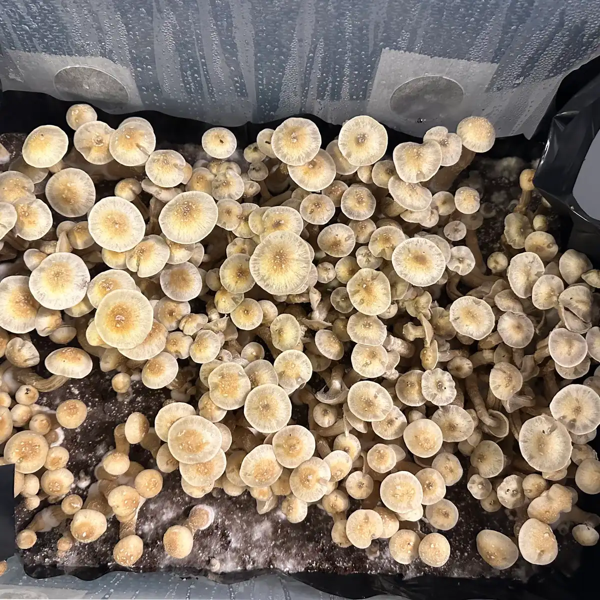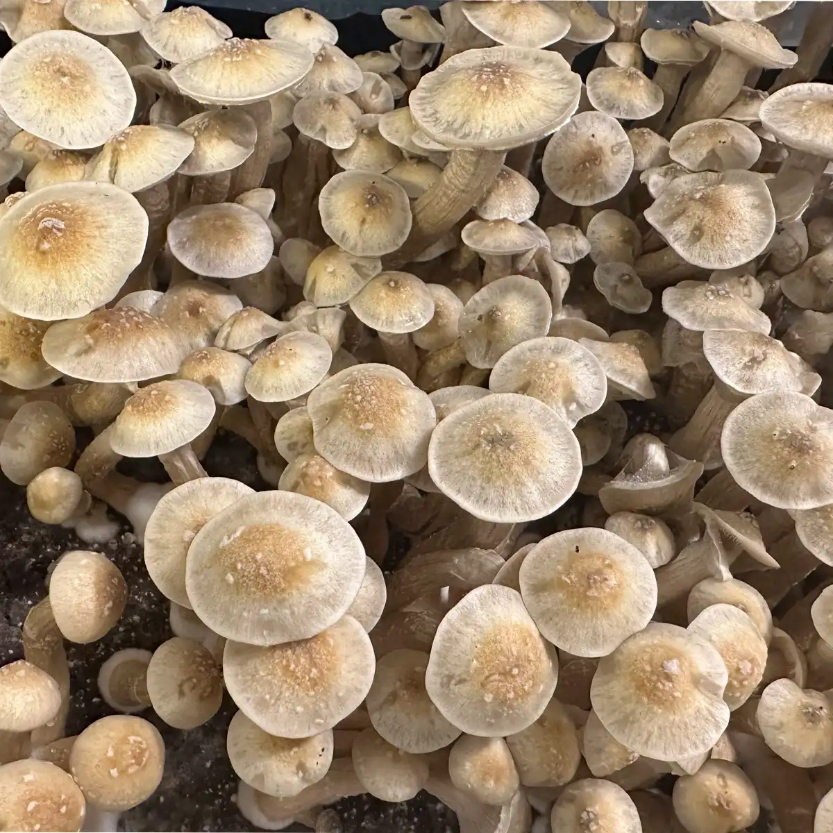 AA+ is a unique leucistic strain. The word leucistic describes an organism that exhibits partial albino traits, with just a bit of pigmentation remaining. This fascinating genetic trait is highly sought after by researchers. Leucistic mushrooms will look pale and albino at first, but still drop dark purple spores.